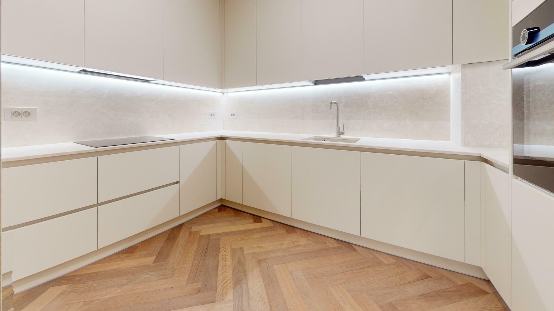 Le salon, baigné de lumière grâce à de grandes baies vitrées, offre un vaste espace de vie convivial. Un couloir entièrement équipé de rangements intégrés mène vers une cuisine moderne, entièrement équipée et au design épuré, attenante à un cellier fonctionnel doté de nombreuses étagères.